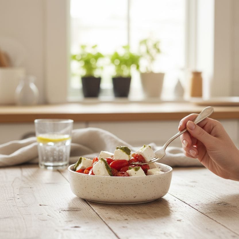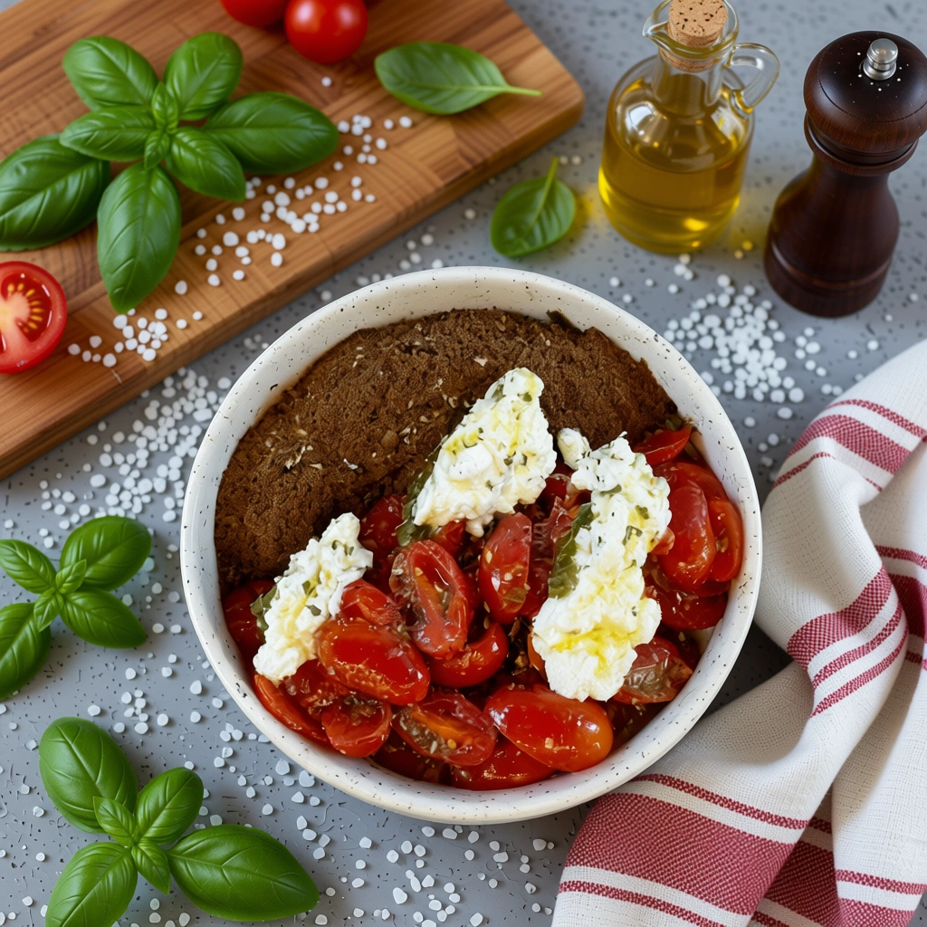 Σαλάτα με ντοματίνια, ανθότυρο, βασιλικό, dressing λευκού βαλσαμικού & ελαιόλαδο