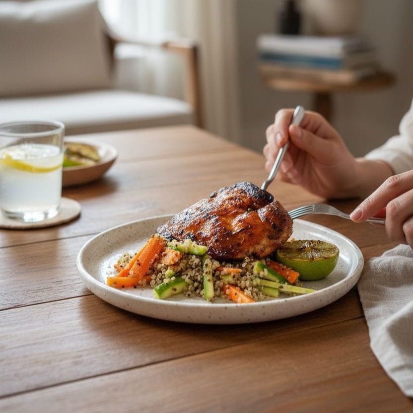 Φιλέτο μπούτι κοτόπουλο, συνοδεύεται από κινόα με λαχανικά & lime sauce
