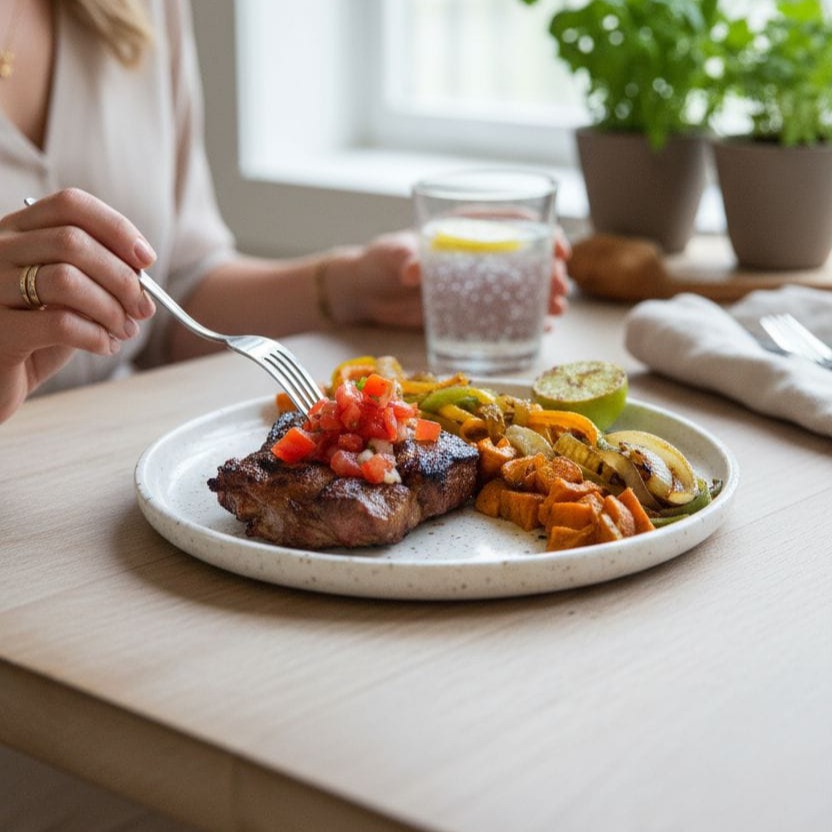 Φιλέτο μπούτι κοτόπουλο με πολύχρωμες πιπεριές, ψητή γλυκοπατάτα, σάλτσα pico de gallo, κρεμμύδι, χυμό lime & ελαιόλαδο
